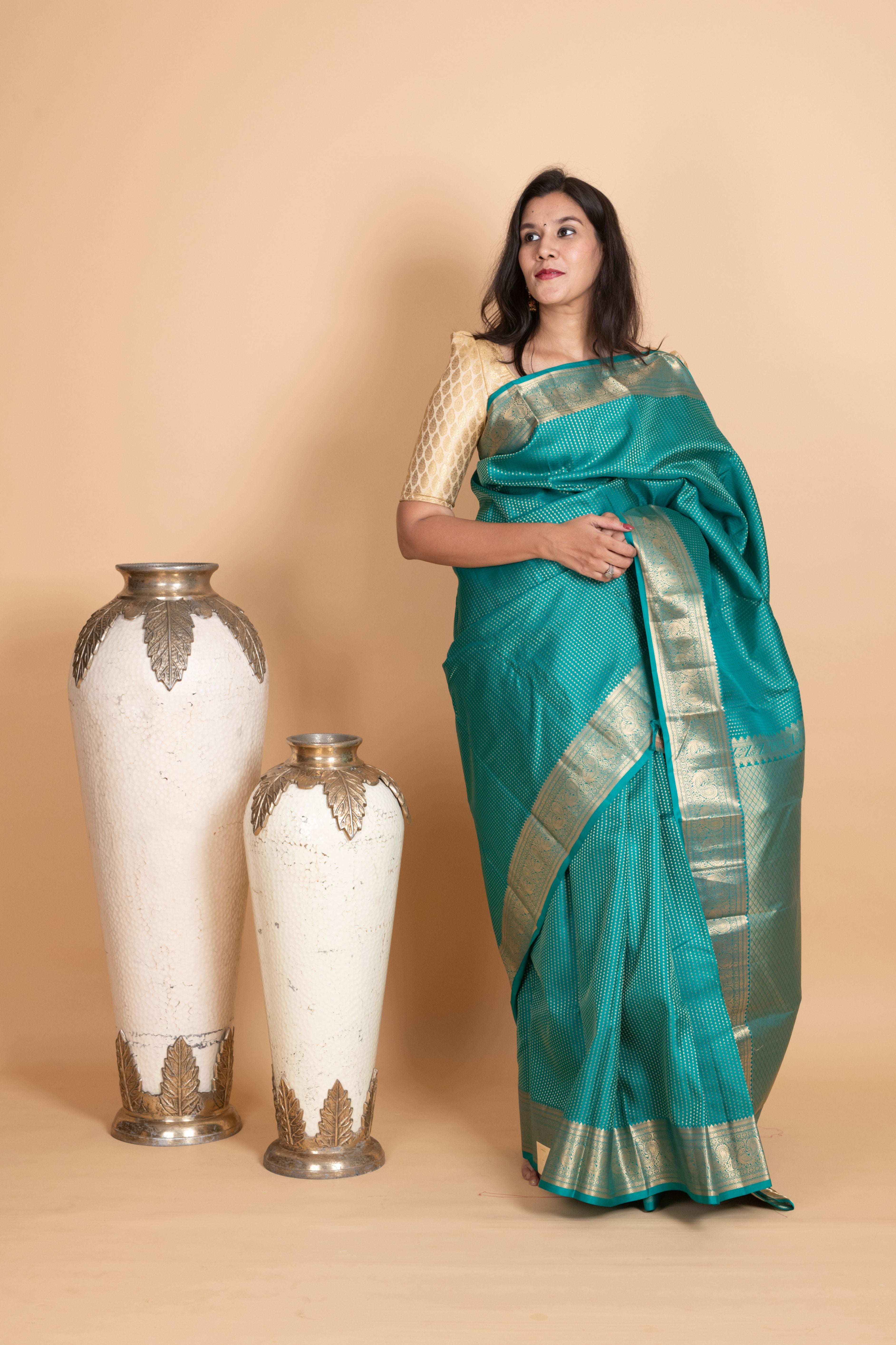 Saree Colour: Peacock Green Zari: Gold Weaving Technique: Butta WeaveBlouse Colour: Peacock Green