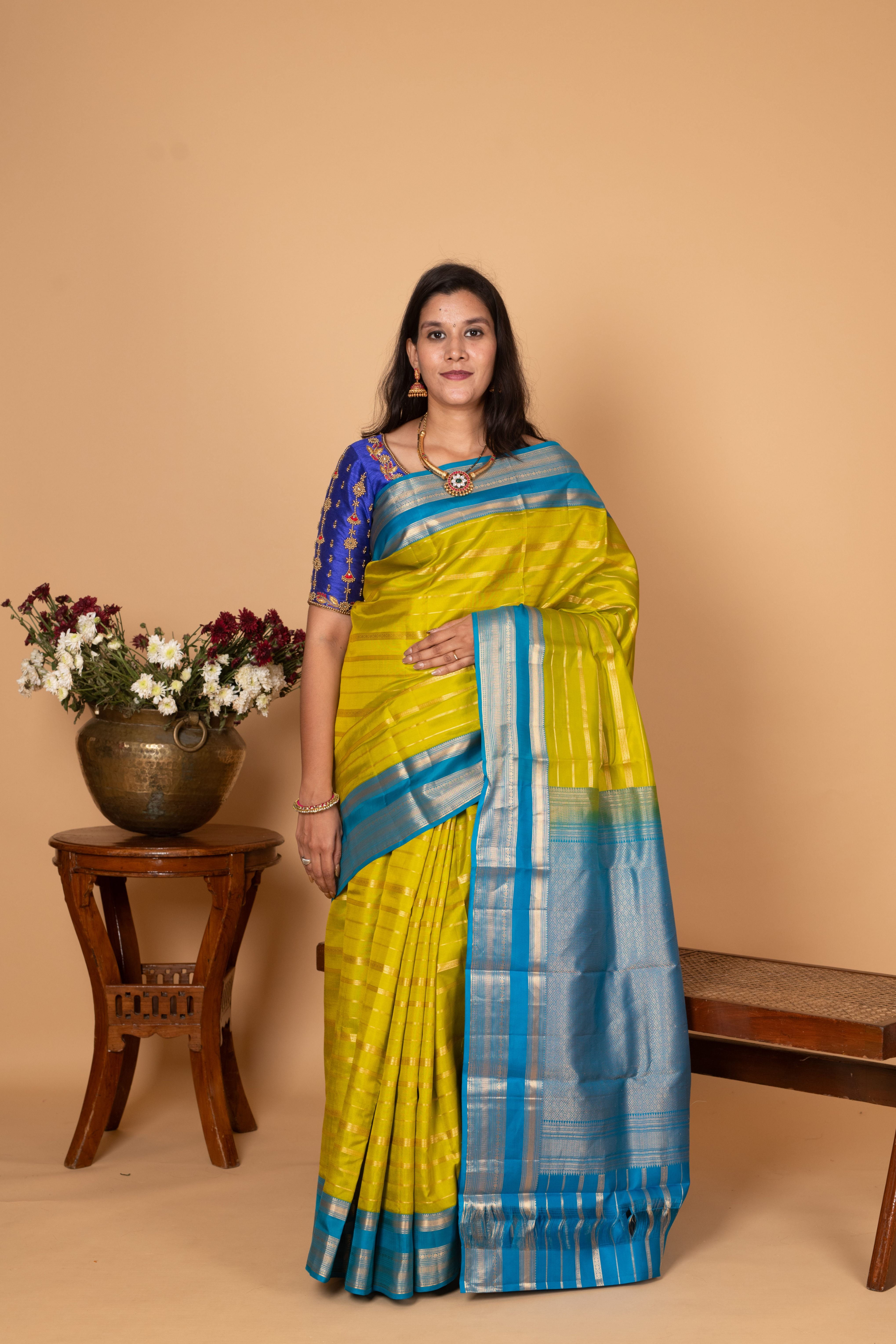 A refreshing and luminous Pear Green (a bright, yellowish-green) forms the main drape. The body is woven with subtle stripes or fine line textures, enhancing the silk's natural sheen and depth. The saree features a high-contrast, wide border and a magnificent pallu (shoulder drape) in a vibrant Electric/Peacock Blue. The Pallu showcases dense zari work, often in classic Kanjivaram geometric or traditional patterns, providing a luxurious weight and finish. The sharp difference in color between the Pear Green body and the Blue border is achieved using the traditional Korvai weaving technique, a hallmark of authentic handloom Kanchipuram silks. Blouse worn...