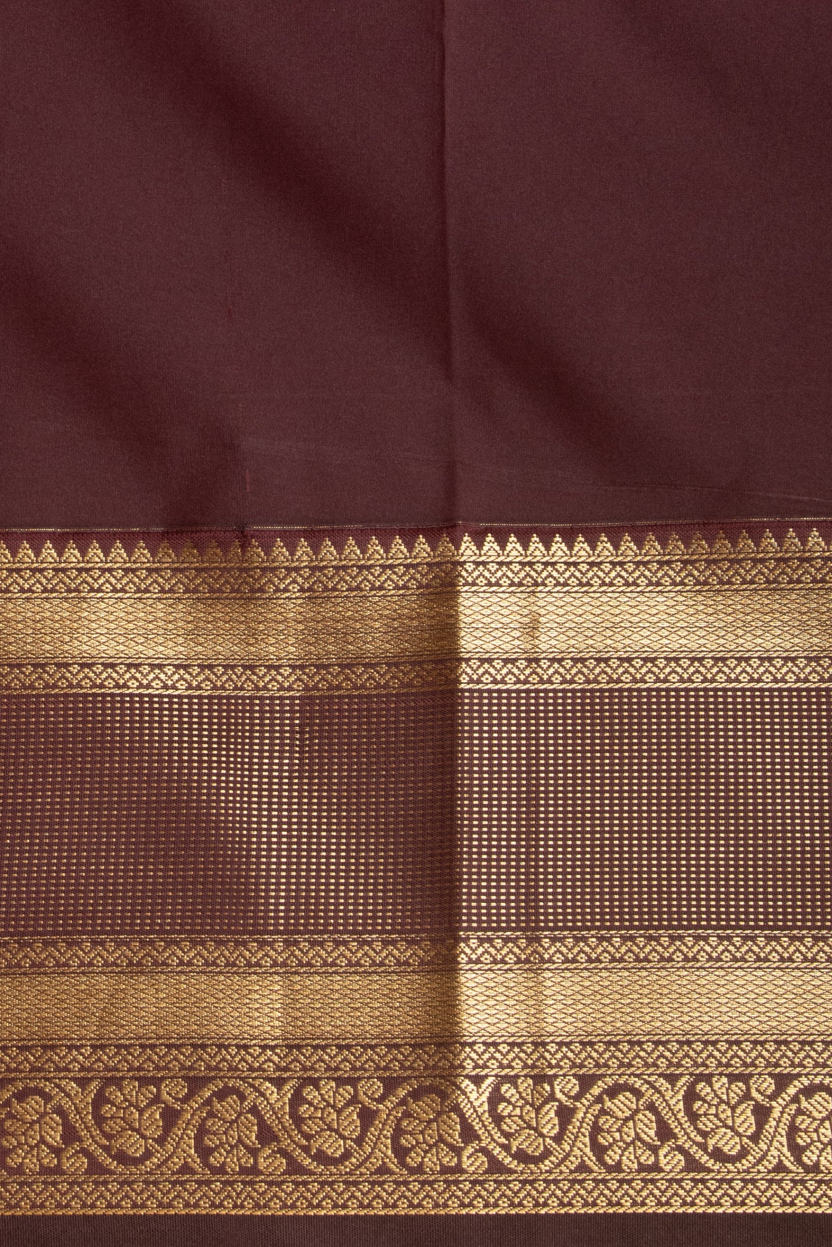 The saree body is a rich, warm Pumpkin Orange, which contrasts strikingly with the wide, geometric Chocolate Brown border detailing. Woven in Kanchi Semi Silk, the fabric offers a beautiful sheen, a structured drape, and comfortable wear, making it perfect for long celebrations. The orange body is plain, allowing the bold border to stand out, and features a single, prominent gold zari medallion motif near the pallu, symbolizing traditional artistry. The wide border is magnificent, featuring:A bold band of Chocolate Brown woven with subtle checks or lines in gold zari.Framed by intricate gold zari bands featuring detailed temple or floral...