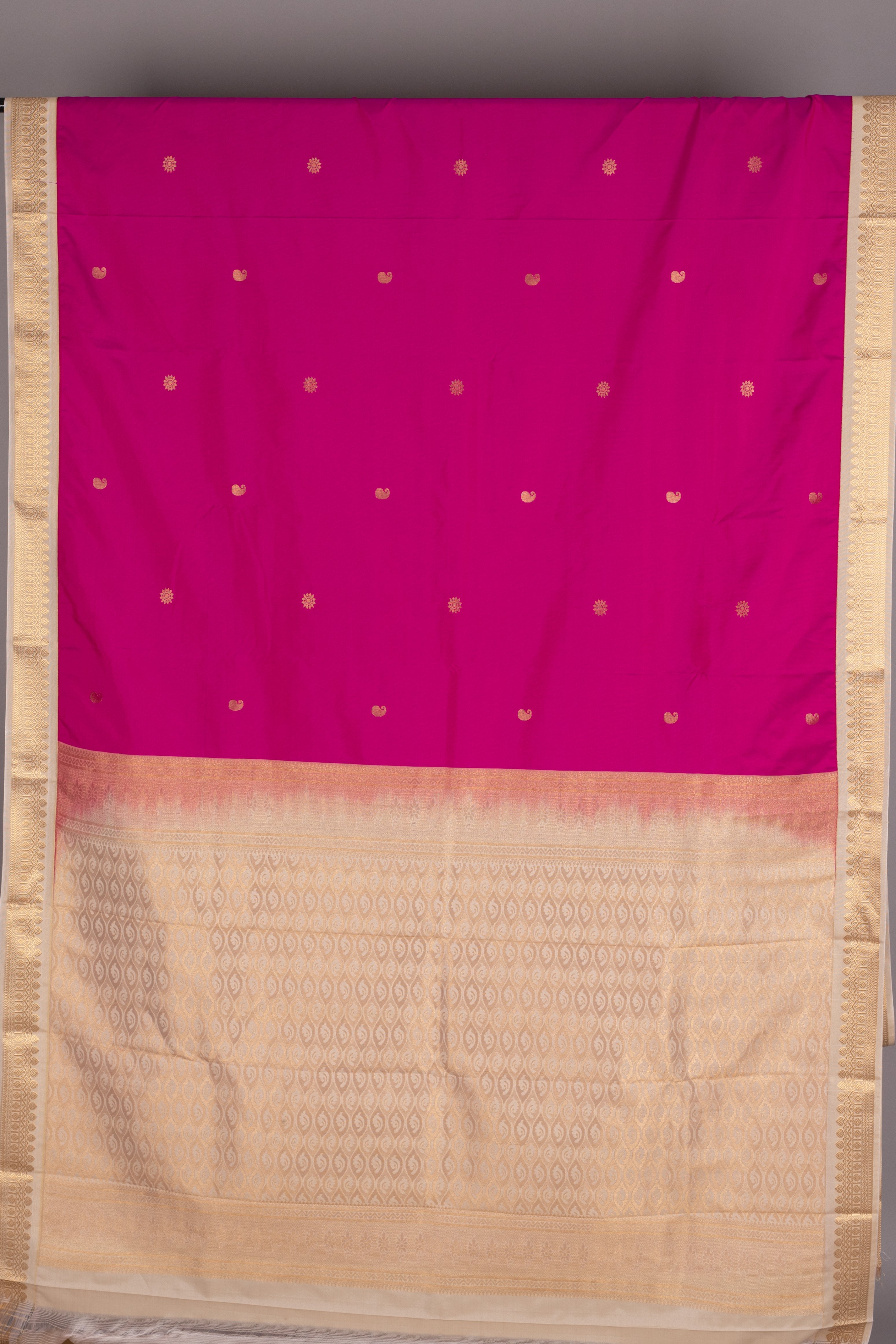 Saree Colour: Rani pink Zari: Gold Weaving Technique: Butta Weave Blouse Colour: Beige