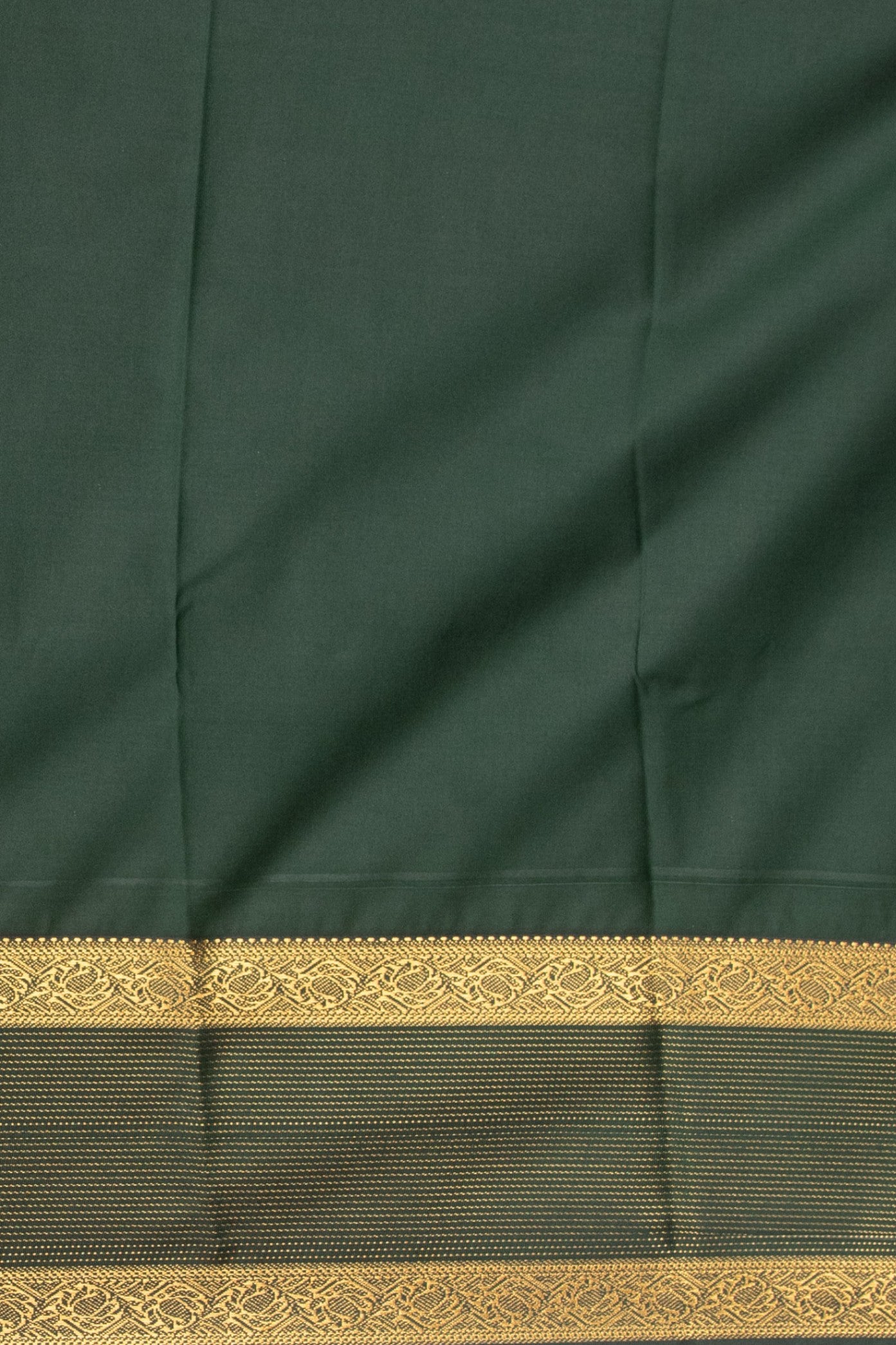 The body is draped in a beautiful, vibrant Rose Pink hue, dramatically complemented by a deep, rich Bottle Green border and pallu. The bright pink field is adorned with neat, scattered rows of delicate gold-toned buttas (small, triangular or leaf-shaped motifs) woven throughout, adding a traditional sparkle. The saree features the characteristic Korvai (Interlocked) border weave, where the color transition between the body and the border is crisp and sharp, signifying traditional handloom artistry The wide border is a luxurious expanse of densely woven gold zari, featuring a detailed, textured pattern.This is framed by solid, commanding stripes of the rich...