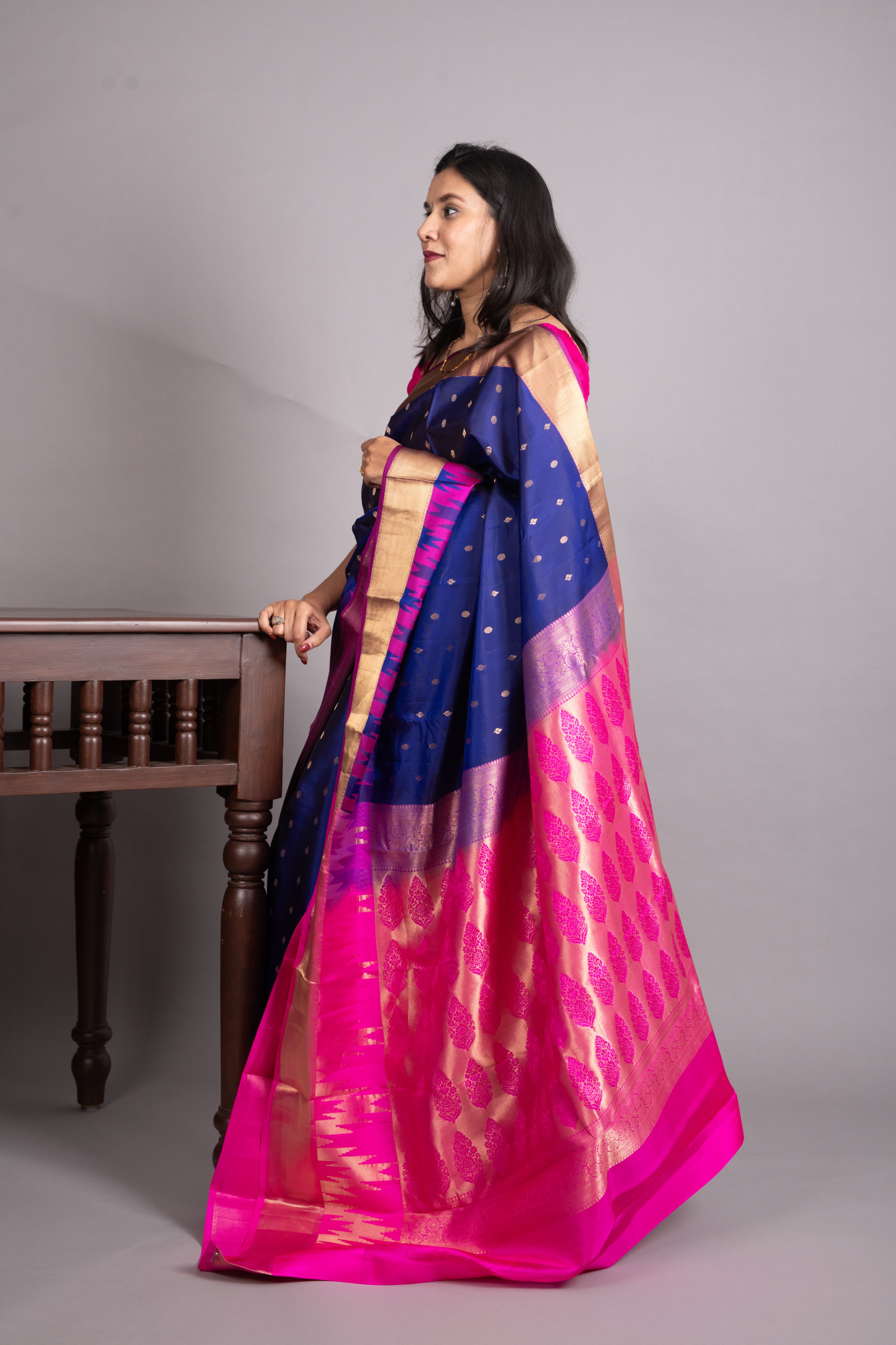 Saree Colour: Royal Blue Zari: Gold Weaving Technique: Butta Weave Blouse Colour: Rani Pink