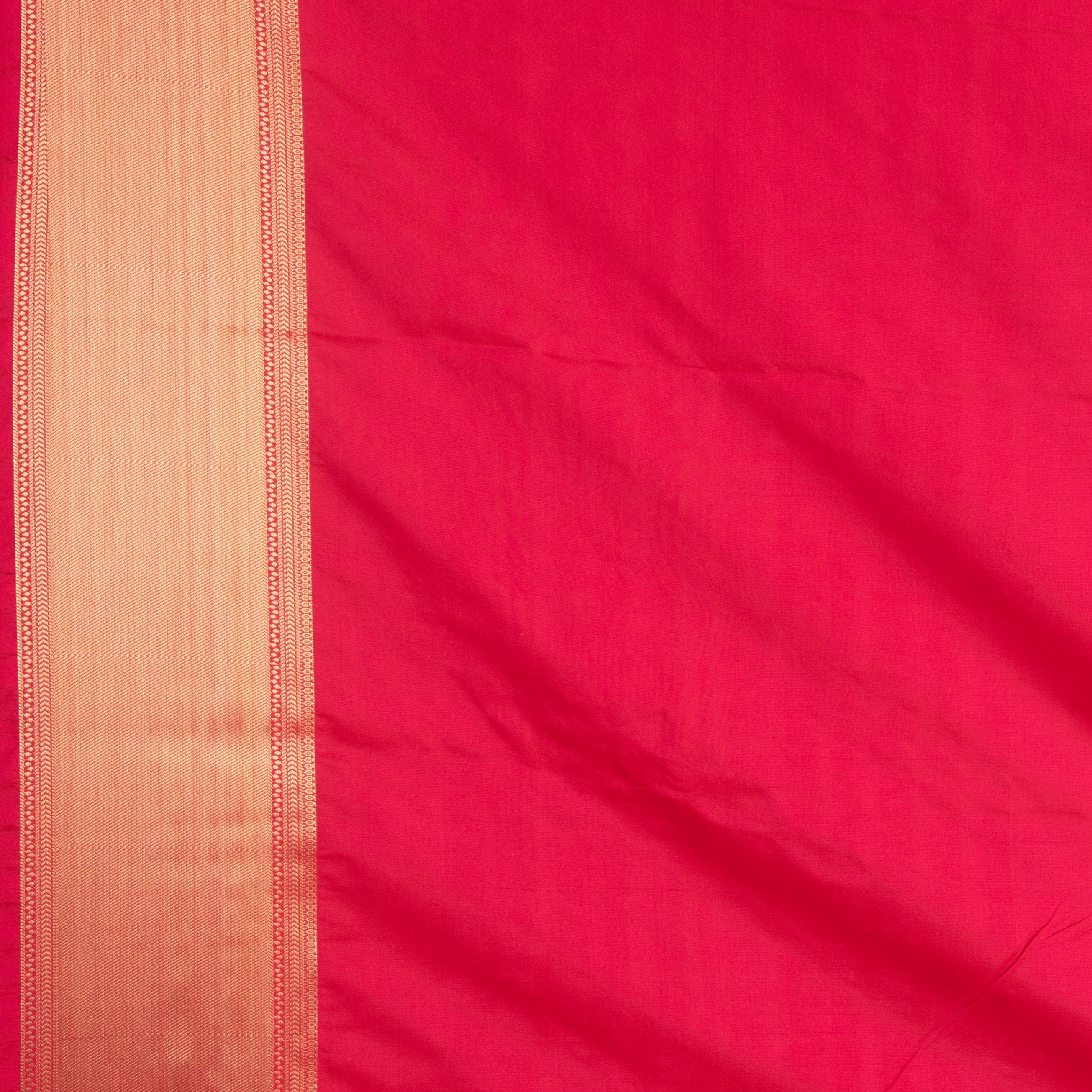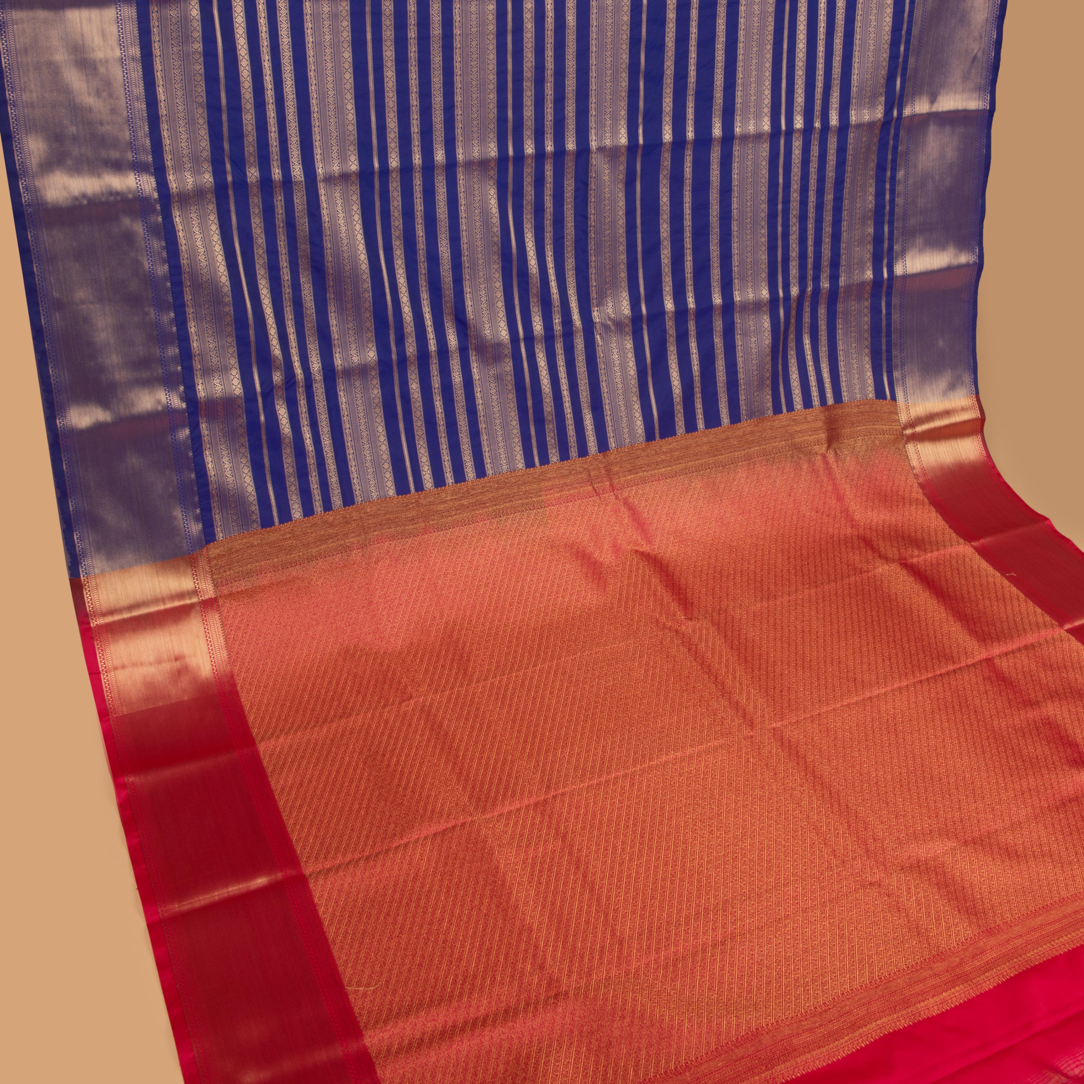 The Royal Blue field is a spectacle of vertical zari weaving, featuring thick, prominent gold-toned zari stripes alternating with the blue silk, giving the saree incredible vertical flow and a dazzling overall shimmer.The border features a narrow band of the vibrant Reddish Pink and is elegantly finished with a rich gold zari weaving that seamlessly connects to the pallu.The magnificent Reddish Pink pallu is the statement piece, densely woven with a fine, textured zari pattern (likely a diamond or geometric mesh) in warm gold and coppery tones.