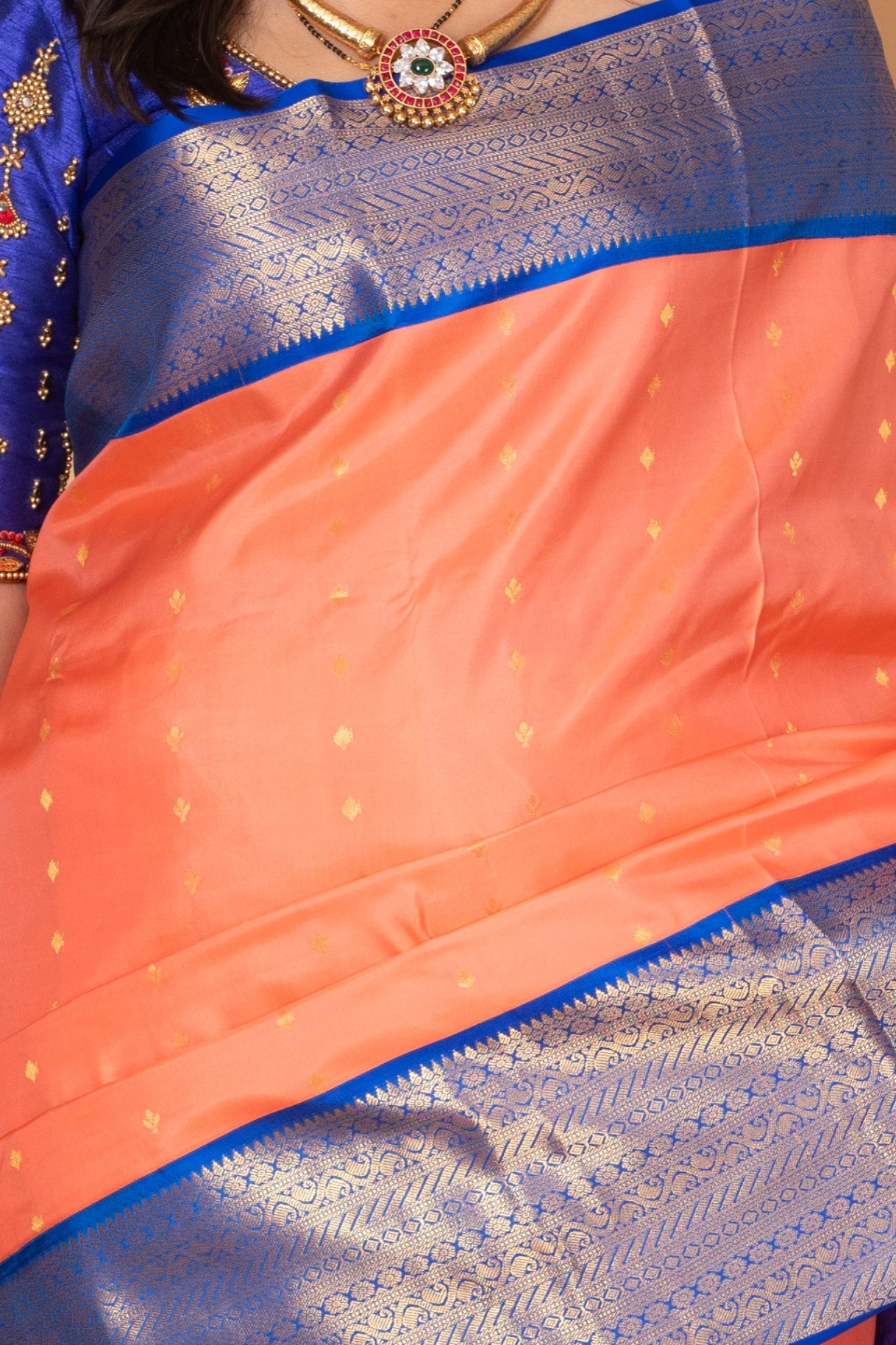 A bright yet soft Salmon Pink or Light Peach forms the main drape. The color is highly flattering and lends a vibrant, radiant quality to the silk. The saree is distinguished by its broad, commanding border and pallu (shoulder drape) in a deep, electric Cobalt Blue (Royal Blue). The blue borders and pallu are lavishly woven with shimmering Gold Zari. The pallu showcases dense traditional motifs and bands, often framed by thin lines of contrasting zari, ensuring a luxurious and celebratory finish. The seamless and sharp color block between the warm pink body and the cool blue border is achieved...
