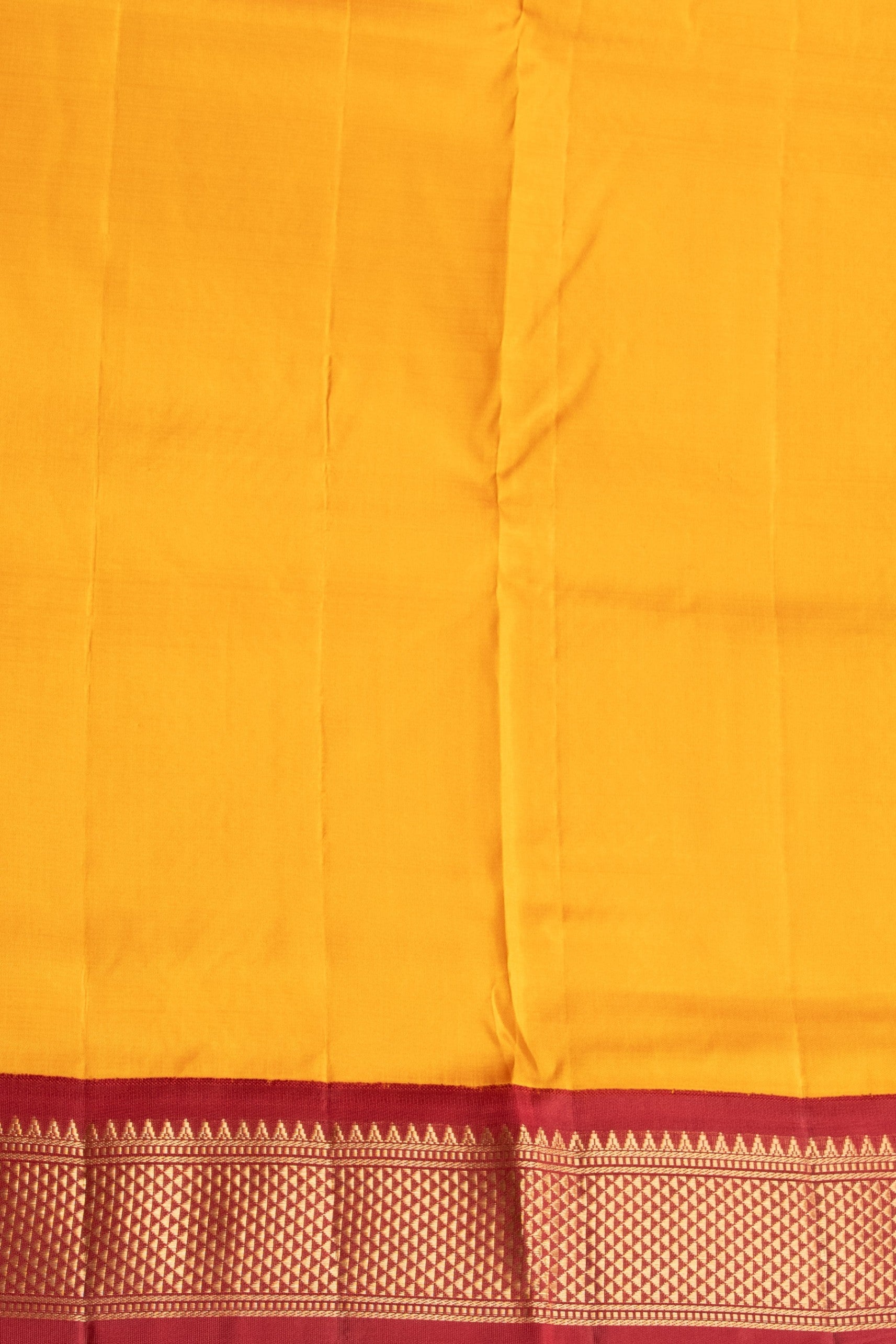 The body showcases a rich, auspicious Turmeric Yellow hue, beautifully contrasted by a bold Maroon (or Deep Red) border and pallu. The pure silk body is smooth and radiant, allowing the natural luster and vibrant color of the turmeric yellow to create a stunning backdrop. The pallu is composed of striking, broad Maroon stripes alternating with shimmering gold zari bands.The gold zari bands feature fine, woven patterns, adding texture and traditional richness.The border is clean and simple, defined by a thin line of silver or gold zari, highlighting the traditional Korvai weave where the body and border colors meet crisply....