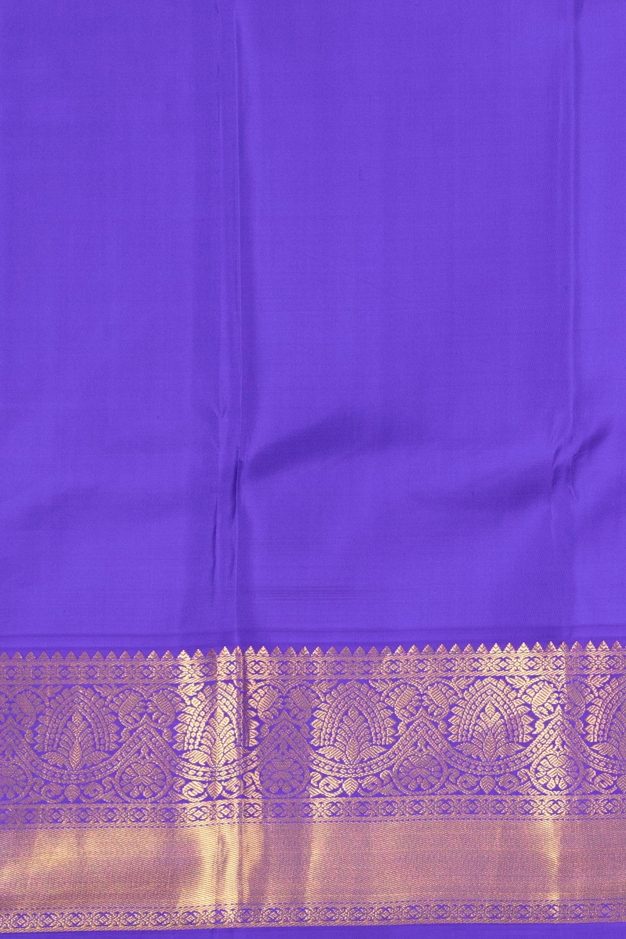 A bright, shimmering Turquoise Blue forms the main drape. The body is woven with subtle stripes or fine checks, adding texture and depth to the silk, and scattered with delicate gold/silver zari buttas (motifs). The saree is distinguished by its broad, highly contrasting Cobalt Blue border and pallu (shoulder drape). This deep color provides a grounding, regal frame. The border and pallu are lavishly woven with shimmering Gold Zari, creating a magnificent, intricate pattern that embodies traditional Kanjivaram artistry. The pallu is particularly dense with zari, ensuring a grand finish. The sharp demarcation between the light Turquoise body and the...