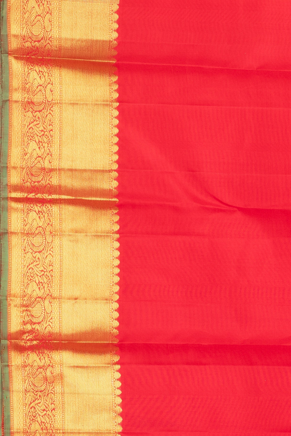 Handwoven Pure Kanjivaram Silk Pattu, known for its rich texture, lustrous finish, and exceptional durability.A vibrant Vermillion Red body exudes traditional warmth and celebratory spirit.The body features an intricate checks pattern woven directly into the silk, with small gold zari buttas placed inside each check