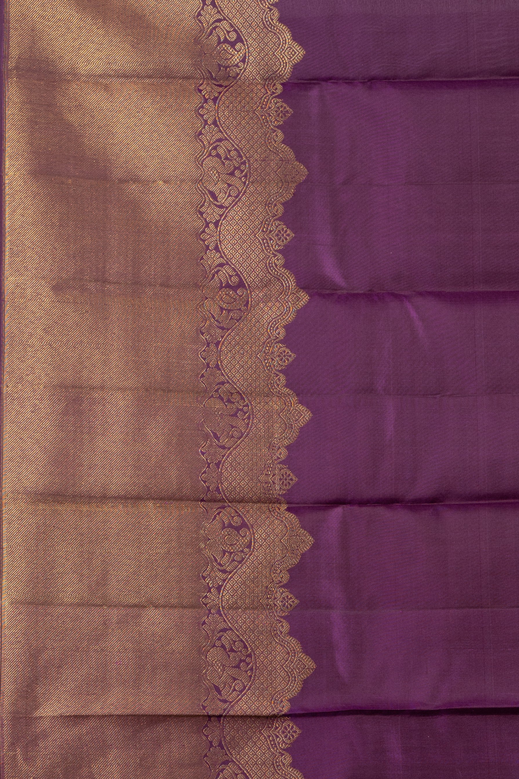 The body of the saree is a rich, opulent Violet a color historically associated with royalty and luxury. This intense, luminous hue is dramatically complemented by the expansive, lustrous Antique Gold border and pallu.Crafted from 100% Pure Kanjivaram Silk, the saree is characterized by its superior weight, smooth drape, and rich natural sheen, a hallmark of authentic Kanchipuram weaving.